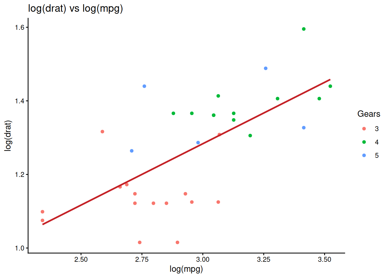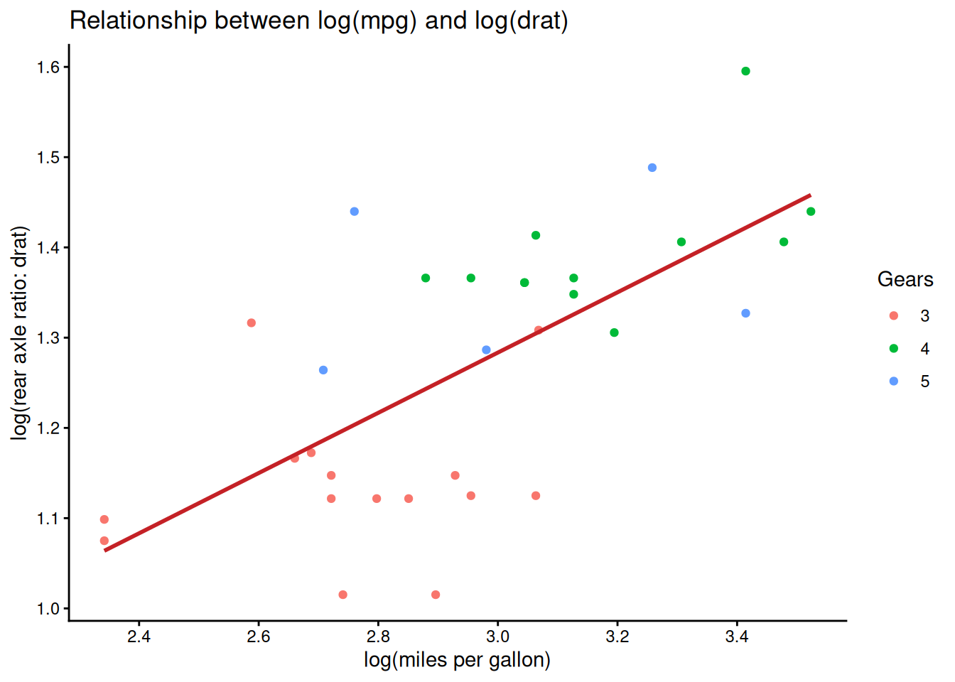 my_graph <- ggplot(mtcars, aes(x = log(mpg), y = log(drat), color = factor(gear))) +