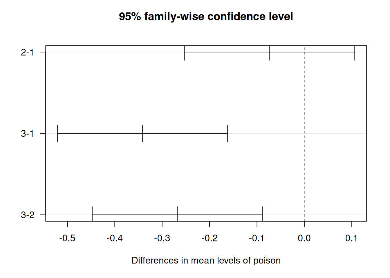 The ANOVA tells you whether any difference exists, but not which pairs differ. Tukey’s HSD provides pairwise comparisons with multiple-testing adjustment.