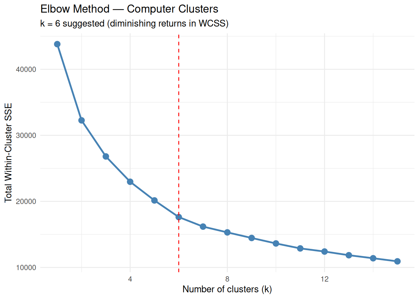 The “elbow” around \(k = 6\) indicates a reasonable compromise between cluster compactness and model complexity.