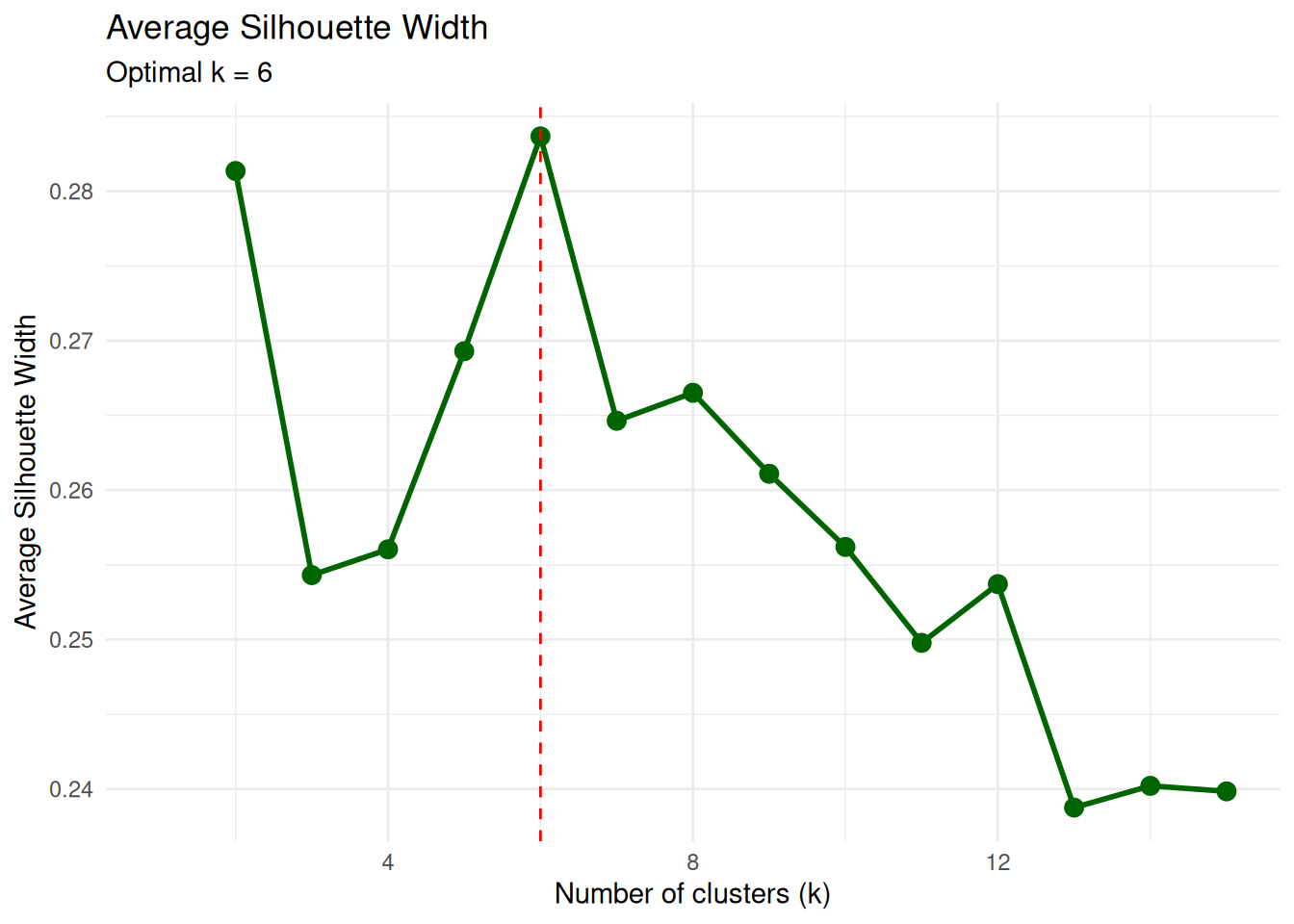 The maximum average silhouette at \(k\) close to 6 is consistent with the elbow method.