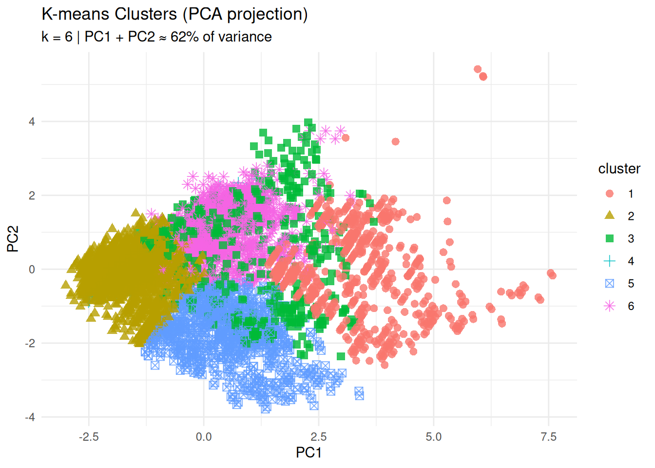 subtitle = "k = 6 | PC1 + PC2 ≈ 62% of variance",