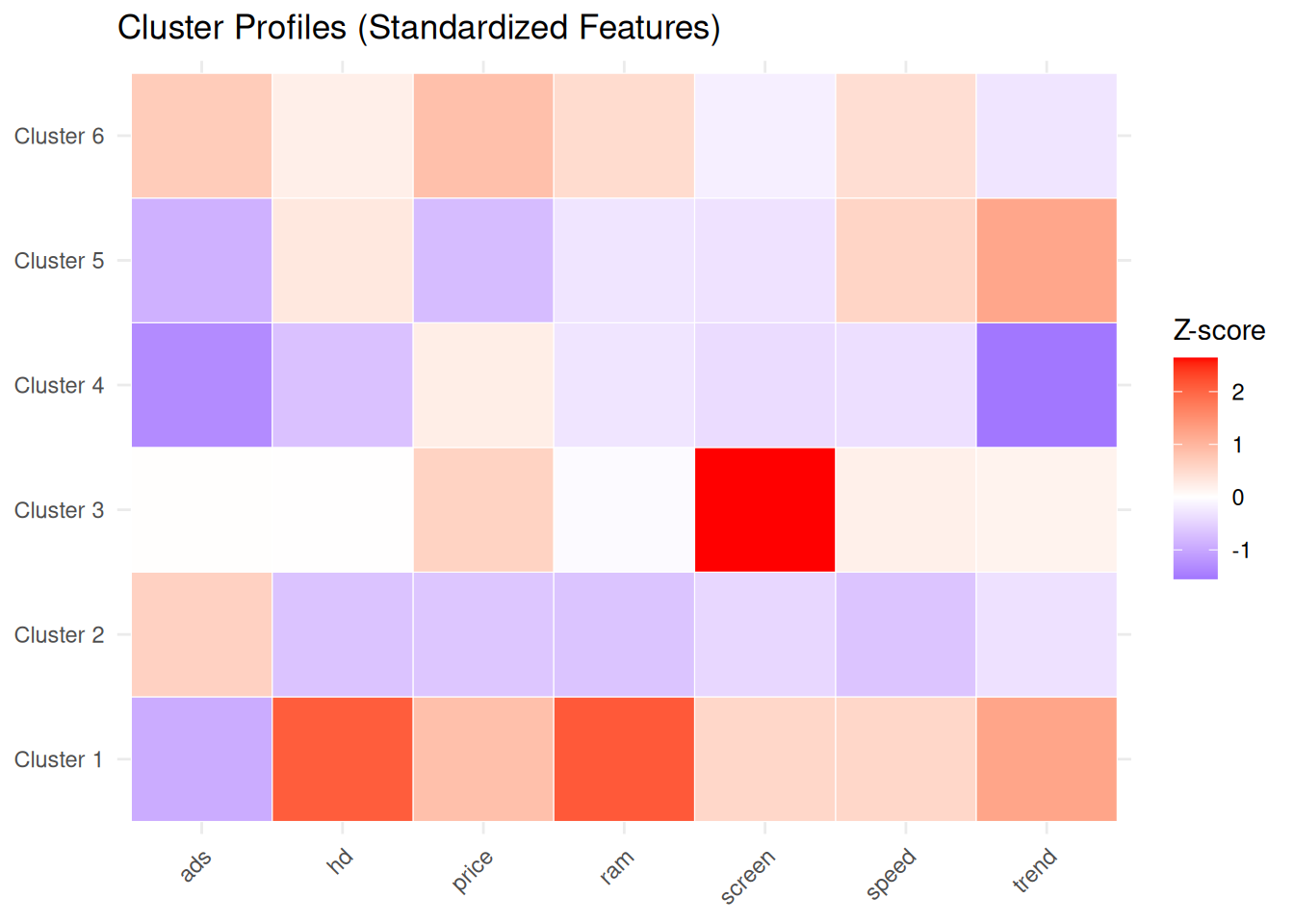 This representation facilitates assigning meaningful labels to each group (for example, “budget machines”, “high-performance workstations”, “premium configurations”, etc.) based on their feature profiles.