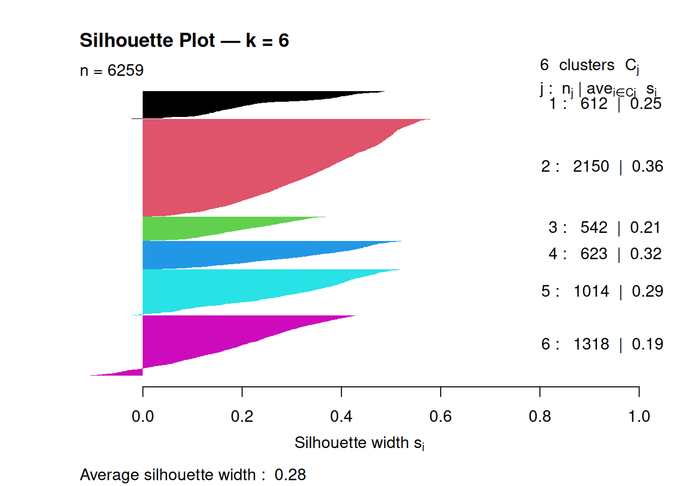 ## Silhouette of 6259 units in 6 clusters from silhouette.default(x = pc_k6$cluster, dist = dist(pc_scaled)) :