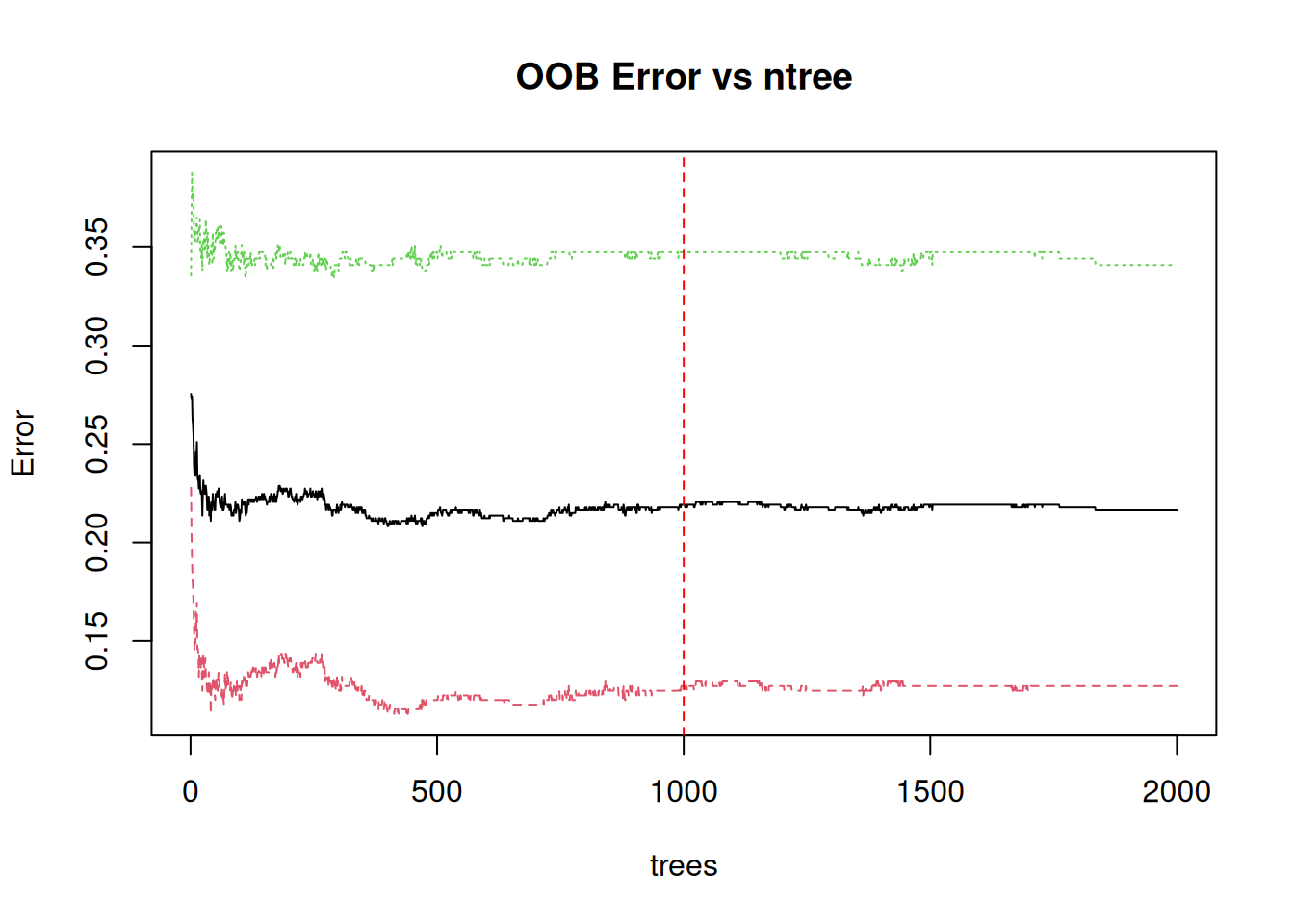 abline(v = rf_base$finalModel$ntree, col = "red", lty = 2)