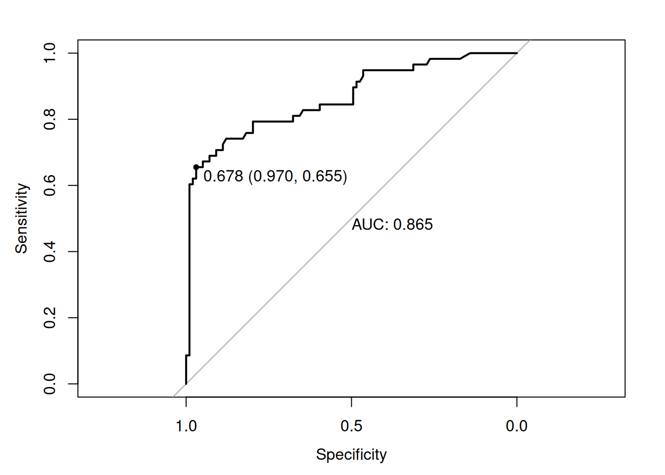 plot(roc_test, print.auc = TRUE, print.thres = "best")