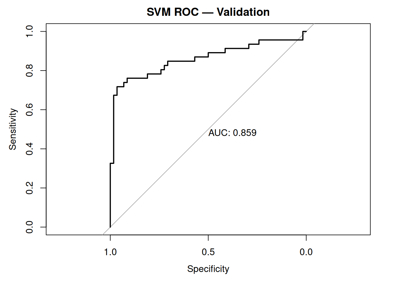 Test: \(AUC \approx 0.85\), Sensitivity 70%, Specificity 89%.