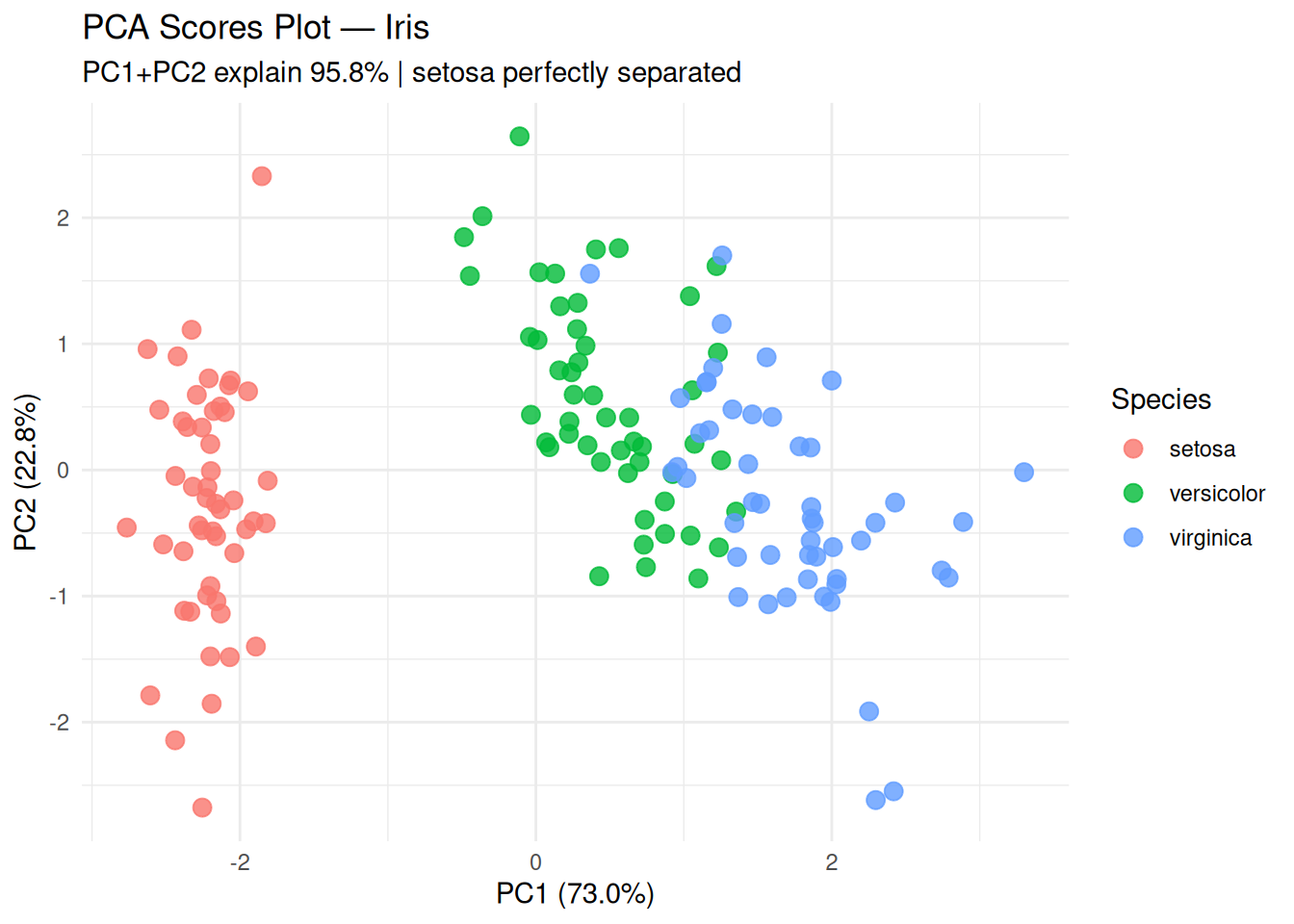 subtitle = "PC1+PC2 explain 95.8% | setosa perfectly separated",