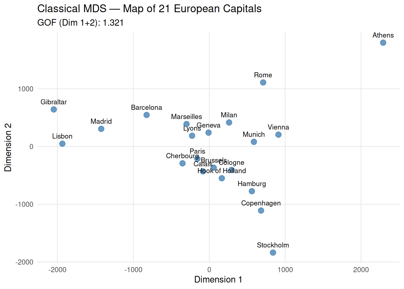 (km) between 21 European capitals, an ideal case for classical MDS