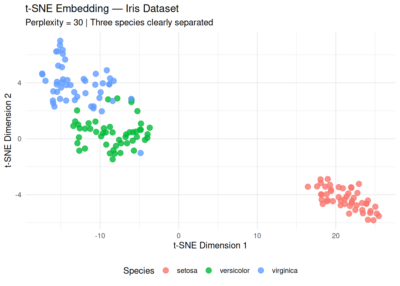 subtitle = "Perplexity = 30 | Three species clearly separated",