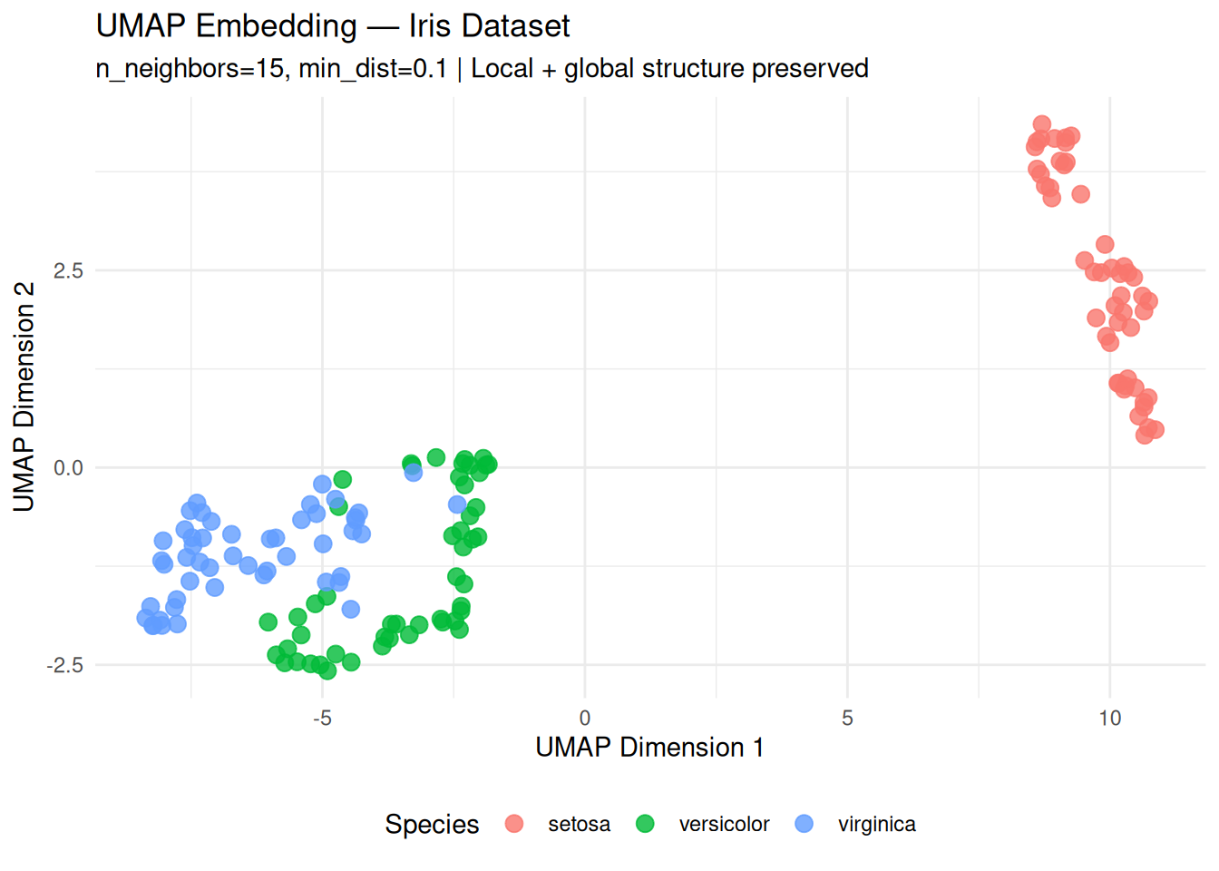n/3)\)); low = local focus, high = global.min_dist: Separation in low-D (\(0.001–0.5\)); low = tight clusters.library(ggplot2)
