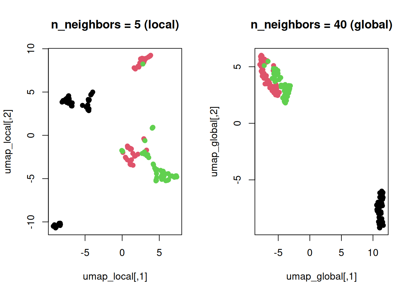 umap_global <- umap(iris_num, n_neighbors = 40, min_dist = 0.1, n_components = 2)