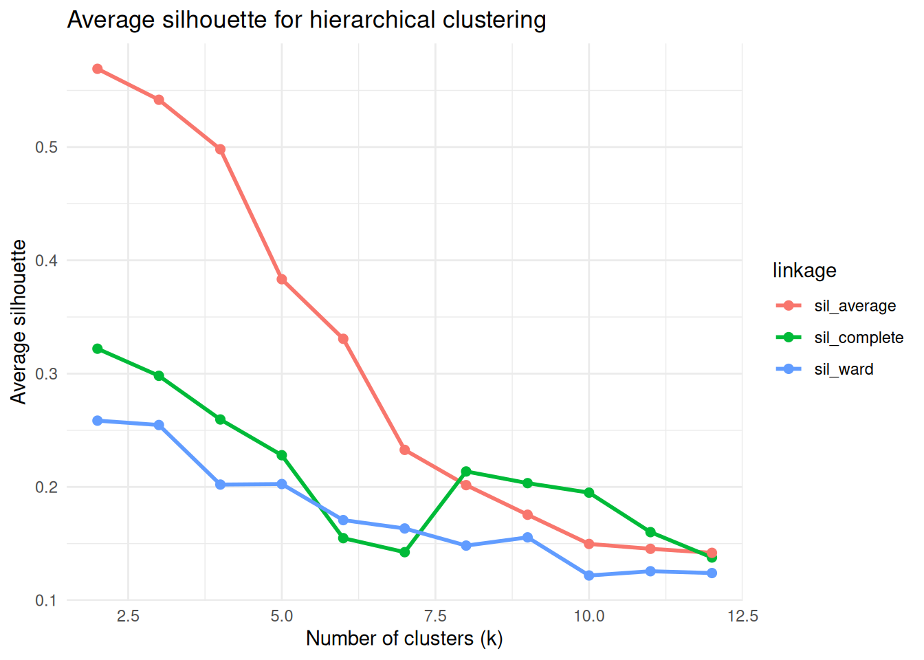 sil_df, cols = -k, names_to = "linkage", values_to = "avg_silhouette"