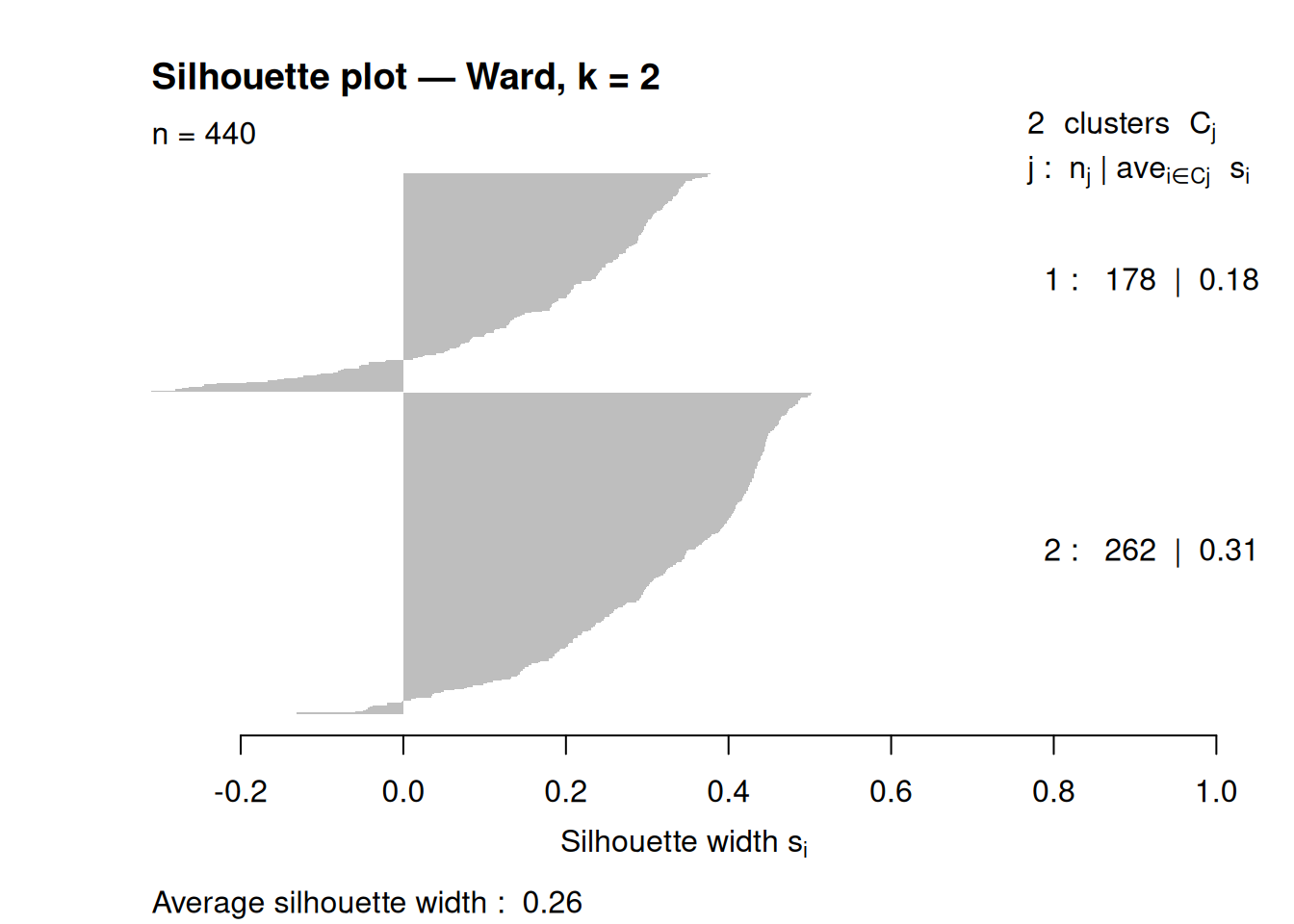## Silhouette of 440 units in 2 clusters from silhouette.default(x = cl_hc, dist = d) :
