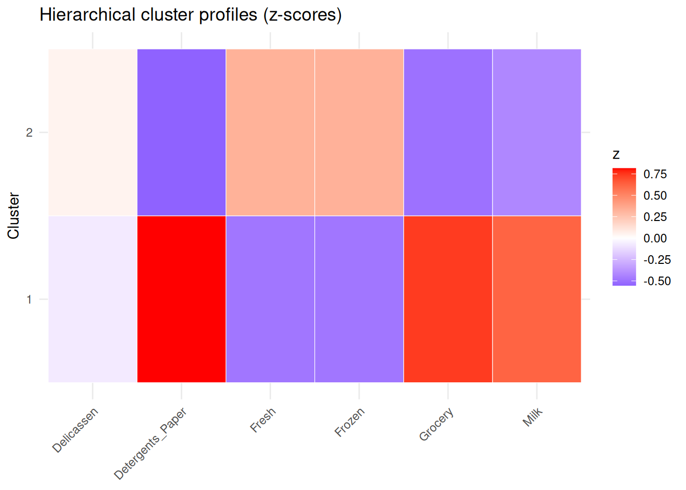 labs(title = "Hierarchical cluster profiles (z-scores)", x = NULL, y = "Cluster")