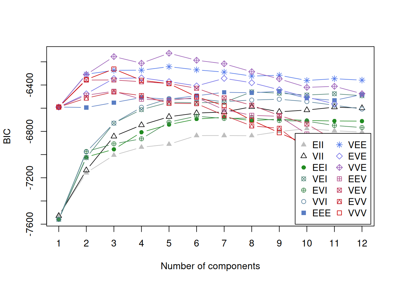 fit <- Mclust(X, G = 1:12, verbose = FALSE)